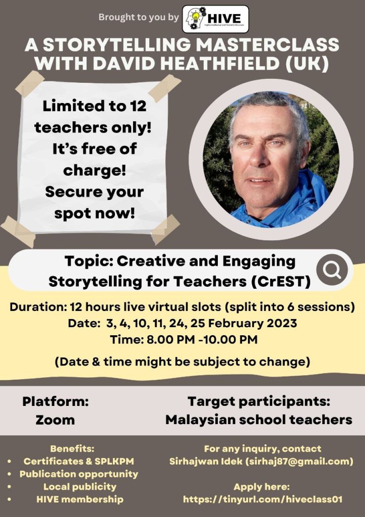 The HIVE team is excited to announce our latest initiative, a storytelling masterclass with David Heathfield, specially for Malaysian teachers.