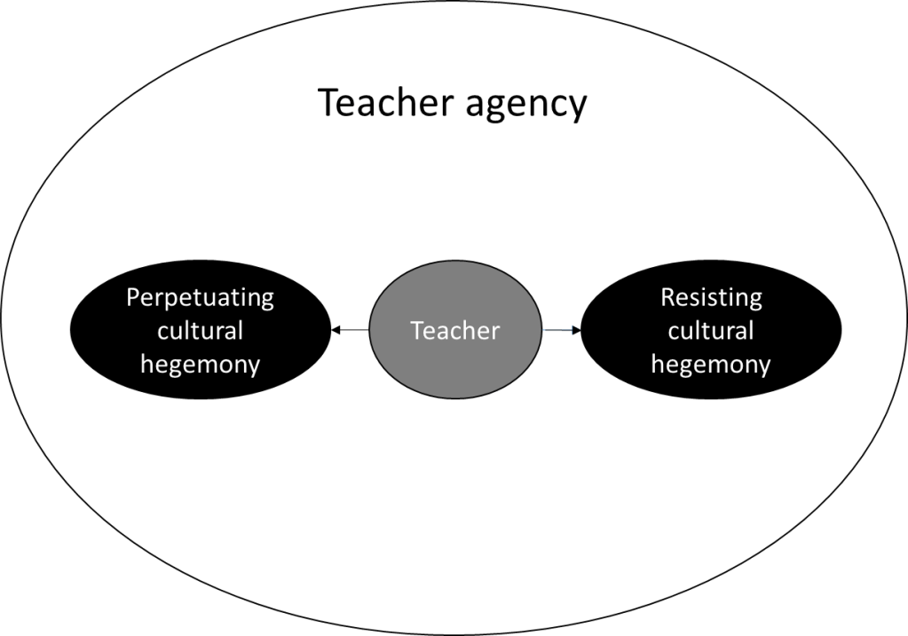 In this context, Priestly et. al’s (2015) model of the ecological model of teacher agency enables such cultural hegemony. In the practical-evaluative domain of the model, teachers’ ability to take action is always influenced by the specific context they find themselves in. This means the teachers are limited by the cultural, structural, and material resources at their disposal. Educators, armed with teacher agency to shape their teaching practices, can passively uphold existing power structures that perpetuate cultural hegemony. When teachers succumb to the status quo, reluctant to question ingrained biases within the educational system, they unwittingly contribute to the perpetuation of cultural hegemony. The lack of critical consciousness when exercising teacher agency for such instances hinders the potential for transformative education.