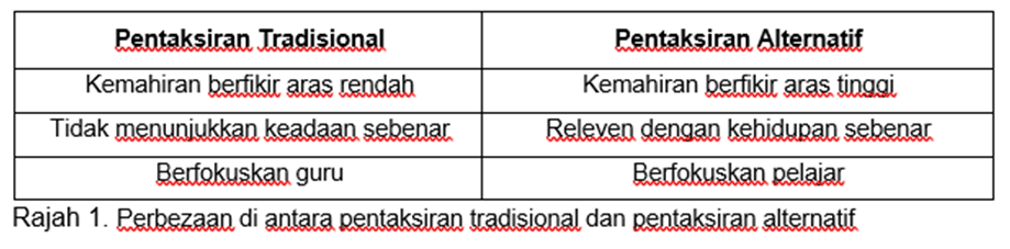 Terdapat dua bentuk pentaksiran yang dijalankan dalam bilik darjah untuk menilai keberkesan pengajaran dan pembelajaran. Antaranya ialah pentaksiran tradisional dan pentaksiran alternatif. Pentaksiran alternatif merupakan suatu bentuk pentaksiran yang berlainan daripada formal seperti penilaian formatif dan sumatif yang digunakan oleh guru di dalam bilik darjah. Rajah 1 di bawah menunjukkan perbezaan di antara pentaksiran tradisional dan pentaksiran alternatif dalam pendidikan matematik.