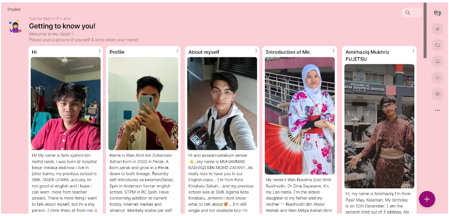 When I first started using Padlet, it was easy to navigate. I started with making simple activities like asking students to introduce themselves in ice-breaking sessions. What I discovered through using Padlet, students are more receptive to the idea, and they seem to respond well to technology use in classrooms.