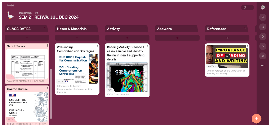 As an English language teacher, I always try to find innovative ways to synchronise my teaching and learning materials, assessments, additional references, and many other things to support students’ learning. In a technologically inclined climate of teaching practices that many learning institutions adopt nowadays, I find myself constantly trying to find a suitable platform to run my classes and staying sane to keep abreast with the fast-paced changes. Not to mention, I was really hesitant to change my ways – the chalk-and-talk approach works really well that I did not find reasons to change my techniques. And then I came across…..Padlet.