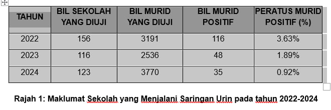 Pada tahun 2023, seramai 48 orang murid positif ujian saringan urin berbanding 116 orang murid positif pada tahun 2022. Pada tahun 2024 pula, hanya 35 orang murid yang dilaporkan positif saringan urin. Ini menunjukkan penurunan peratusan murid yang disaring positif urin iaitu hampir 70% pada tahun 2024 berbanding jumlah pada tahun 2022.