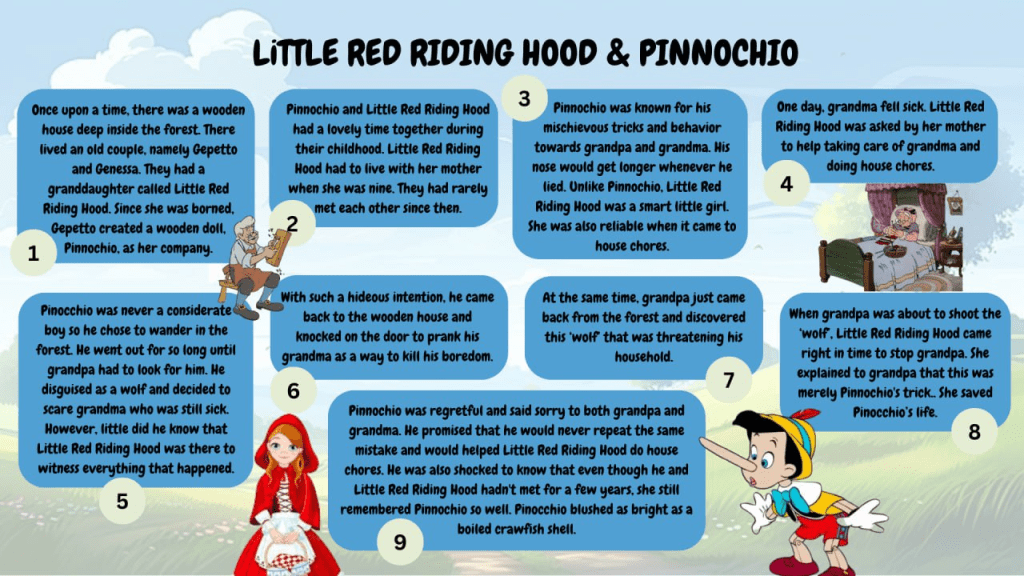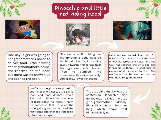 To make the lesson engaging, I used fairy tales such as Pinocchio, Little Red Riding Hood, and Hansel and Gretel as contexts for analysis. Students deconstructed these stories to identify core elements—characters, conflicts, and resolutions—before crafting their own versions. The activity aimed to help them break complex writing into smaller partand rebuild coherent stories.