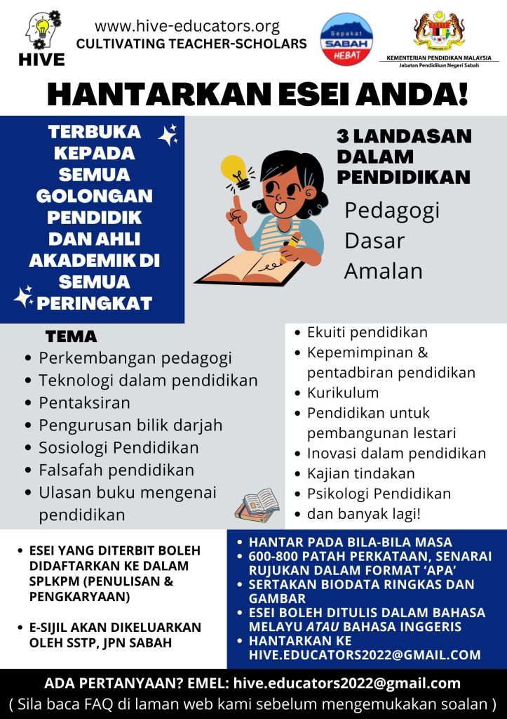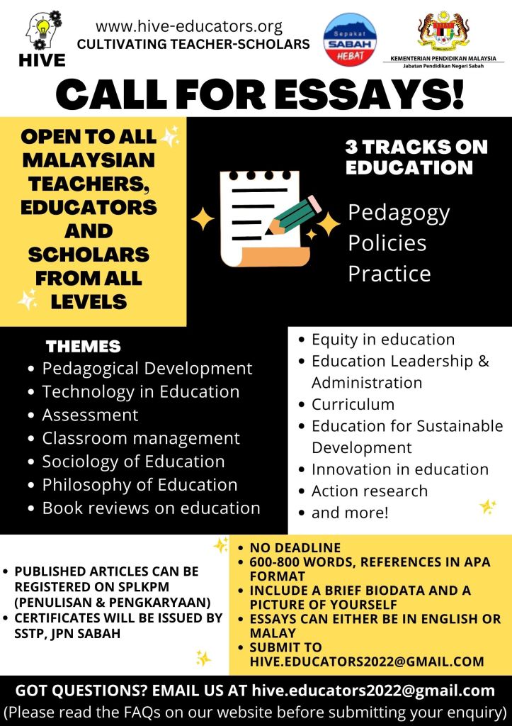 - Topik esei anda boleh berkisarkan amalan, pedagogi atau dasar dalam pendidikan. Esei yang menyentuh isu kritikal dalam pendidikan adalah dialu-alukan tetapi ia seharusnya tidak bertujuan untuk mencetuskan atau menyentuh isu sensitif.